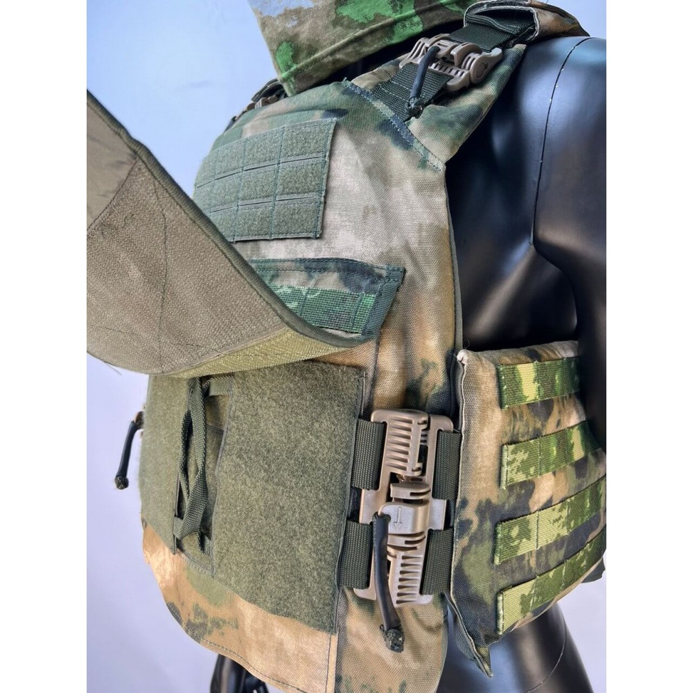 - Мягкая защита: Бронежилет также включает в себя мягкую арамидную защиту, состоящую из 34 слоев арамидно-композитного пакета. Эта мягкая защита размещена на передней, задней и боковых частях бронежилета.